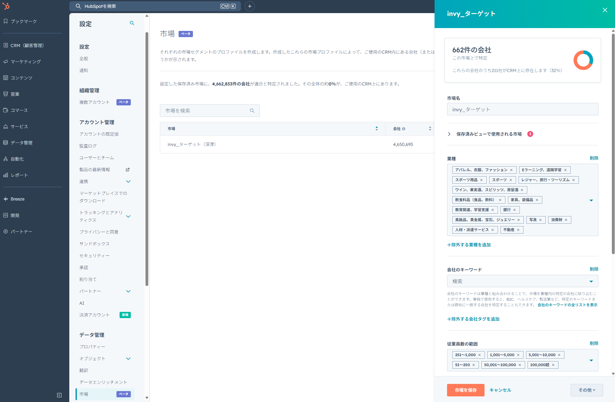 また、HubSpotでは「市場」セグメントのプロファイルを作成することも可能です。