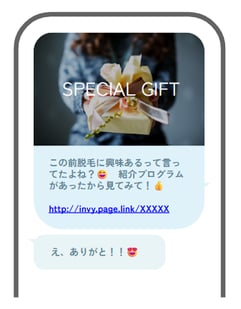 さらに、紹介URLとともに商品のおすすめポイントや感謝・応援の一言を添えたメッセージを添えて送ったりと、商材特性やキャンペーンの訴求に合わせた紹介を行うことで、紹介率の向上はもちろん、紹介経由の購入にも大きく貢献します。