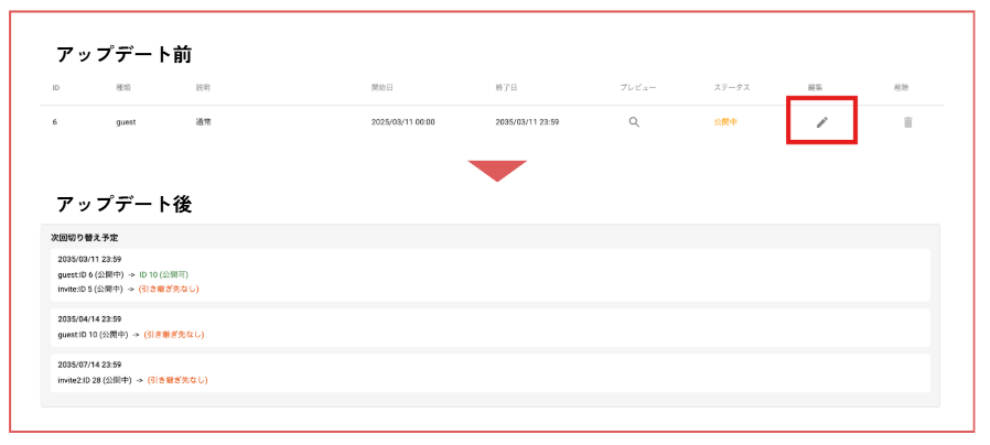今回のアップデートにより、「紹介ページ一覧」上で切り替えスケジュール(タイムライン)を一括でご確認・編集いただけるようになりました。